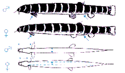 На рисунке (стр. 180) изображен самец орнатуса, а под ним самка. Значки рядом с головой рыбок у жаберных крышек обозначают пол. По стрелкам, указывающим на характерные различия формы плавников, видно, что спинной плавник (в формулах его обозначают буквой D — дорсальный), парные брюшные плавники (обозначают буквой V) и анальный плавник (обозначают буквой А) у самца значительно длиннее, а спинной заострен. У акульего барбуса (акульего балантиохейлуса) (стр. 180) и акантофтальмуса Кюля (стр. 181) еле заметны различия формы туловища в брюшной части. У самки акантофтальмуса голова короче, чем у самца, и меньше грудные плавники (обозначаются буквой Р — пекторальные). У лазоревых нанохромов (стр. 181) самец несколько крупнее самки (рыбы, охраняющие потомство), лоб у него чуть-чуть круче (у многих цихлид признаком самца является жировой нарост на лбу, отчего последний выглядит круче и мощнее, чем у самки), а спермопровод маленький, шиловидный (у самочки яйцеклад крупнее, имеет форму усеченного конуса). Эти признаки (а также более длинные и заостренные анальные и спинной плавники у самца, грушевидный яйцеклад у самки) являются характерными для многих видов семейства цихловых.