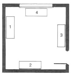 Схема расположения аквариума в комнате: 1. 2, 3 — правильно; 4 — неправильно