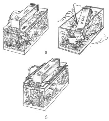 Размещение осветителя на аквариуме: неправильно (на покровном стекле); б — правильно (на подставке)