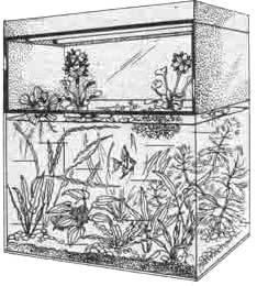 Эти аквариумы должны иметь высокие колпаки, чтобы источники света были подняты над поверхностью воды на 20 - 30 см. Такие колпаки целесообразно делать с прозрачной передней стенкой для удобства обзора поверхности воды. Источники света надо прикрывать отражателями, чтобы свет не попадал в глаза наблюдателю.