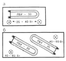 На схеме лампа ЛБУ - 30 мощностью 30 Вт обеспечивает освещение 60л, остальные 40л освещают лампы накаливания 25 - 40 Вт. Освещение двухсотлитрового аквариума обеспечивают две лампы ЛБУ - 30 (примерно на 120 - 150 л) и две лампы накаливания по 40 - 60 Вт.