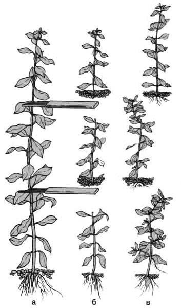 Если черенки длинностебельных растений взяты из средней части, при посадке в новый грунт, даже в том же аквариуме, их рост всегда заметно приостанавливается. Одновременно с молодыми корнями, образующимися у основания нижнего листа, в пазухах верхних листьев из ростовых почек образуются молодые побеги, как правило -два-три. Скорость роста восстанавливается после того, как молодые побеги набирают достаточную массу.