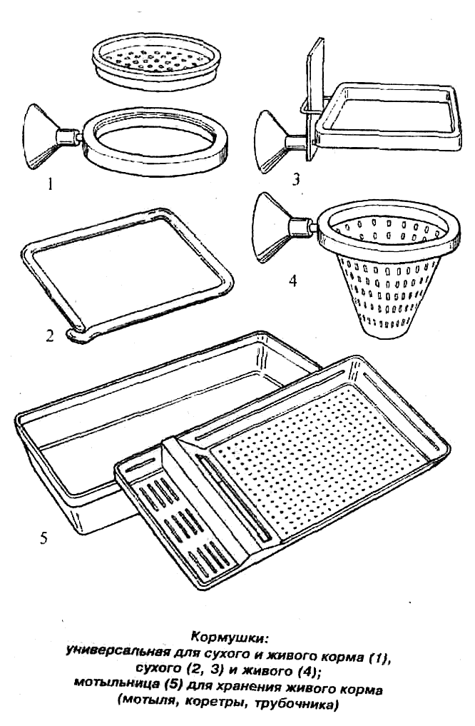 Живой корм перед кормлением должен быть промыт в сачке под краном, причем температуру воды делают близкой аквариумной. Мотыль и трубочник можно давать в специальной кормушке с отверстиями в дне. Ее преимущество заключается в том, что живые экземпляры корма сами перебираются в воду, вялые же и мертвые остаются внутри. Сухой корм насыпают в положенное на поверхности воды кормовое кольцо. Оба вида кормушек имеются в зоомагазинах.