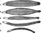 Открытие это сделано всего несколько лет тому назад итальянским ученым Грасси, которому удалось в аквариуме проследить постепенное развитие этой рыбы-личинки до полного превращения в угря. Вначале личинки эти походят на сплющенных пиявок (рис. 7.132, 1—4) с удлиненной головой и обхватывающим заднюю часть тела. плавником, а затем становятся все тоньше и круглее, пока не превратятся в нитевидного угрика (рис. 7.132, 5). При этом они так бесцветны и прозрачны, что сквозь тело их можно, как сквозь стекло, читать буквы. Вследствие этого в воде их совсем не видно и о присутствии их можно узнать только по их темным глазам. Величина их от 5 до 6 см.