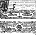 Так прожили миноги более года, продолжая оставаться в своих норках, из которых вылезали только изредка и затаскивали туда даваемый им корм, который состоял не только из земляных червей, но и из мелких рыбок, улиток и мотыля. Тогда любитель решил обследовать, как же устроены их норки. Выловив при первом удобном случае своих миног, он приступил осторожно к исследованию вида норки сначала сбоку, а затем к постепенному исследованию слоев песка и земли и сверху. И вот глазам его представилась картина, изображенная на рис. 7.136.