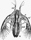 Заключенное в раковину тело дафнии имеет 5 пар ножек, которые, однако, не служат ей для передвижения, а движением своим лишь производят приток воды, приносящий ко рту пищу, а кроме того, так как на них находятся еще жабры, при помощи которых дафния дышит, то движением своим способствуют и притоку к этим жабрам свежей воды.