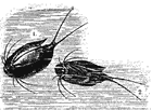 Мелкий грушеобразный рачок (на рисунке он изображ. сильно увел.) с длинным хвостом и одним помещенным на передней части головы неподвижным глазом, от которого он получил свое название — циклоп. Щупалец две пары, ног 6 пар. Цвет его очень изменчив, то беловатый, то зеленоватый, то коричневый, то красноватый и зависит, по всей вероятности, от свойства воды. Самка отличается от самца тем, что несет по обеим сторонам живота широкие, плоские, наполненные яичками мешочки, придающие ей какой-то крылатый вид. Вышедшие из яиц молодые циклопики имеют только одну пару щупальцев и две пары плавательных ножек и вообще имеют очень мало сходства со своими родителями, на которых становятся похожи лишь после нескольких линек. Превращения эти довольно интересны, а потому обращаем на них внимание любителей.