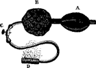 Затем следуют уже способы при помощи более сложных воздуходувных аппаратов. Из них самый простой это — аппарат, при помощи которого производится обычно пульверизация духов. Аппарат этот (рис. 15.1) состоит из двух каучуковых шаров: твердого А и мягкого, растяжимого В, покрытого филейной красной или зеленой сеткой. К последнему прикреплена гуттаперчевая трубка, посреди которой находится кран С. Трубка оканчивается куском пористого угля D.